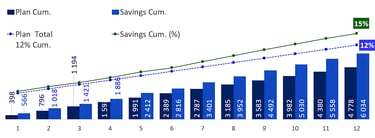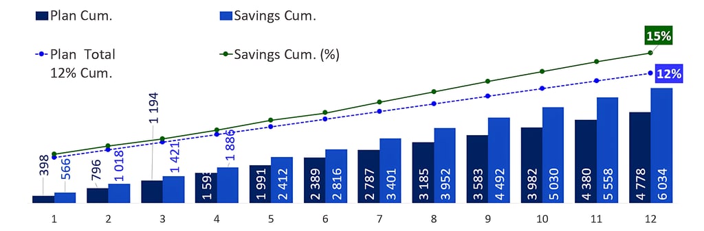 sowohl kumuliert als auch monatsweise liegen die realisierten Einsparungen über den geplanten Zielwerten,