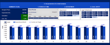 Die relevanten Buchungs- und Bestelldaten werden automatisiert aus dem führenden ERP-System übernommen. Plan- und Forecast-Werte stammen aus dem angebundenen Planungs- bzw. Konsolidierungstool. So ist monatlich klar ersichtlich, wie sich die Ausgaben je Standort, Bereich und Kategorie entwickeln – immer im direkten Vergleich zu Budget und Forecast.