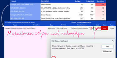 Der To-do-Bereich macht aus jeder Abweichung eine konkrete Aufgabe. Mit einem Doppelklick werden die Stammdaten des Projekts übernommen; die Anwender: innen erfassen Problem und Maßnahme und tragen nur noch die gewünschte Dauer in Arbeitstagen ein. Das Tool berechnet daraus automatisch das Fälligkeitsdatum, vergibt den Status (offen, in Bearbeitung, erledigt) und hält die Verantwortlichen fest.