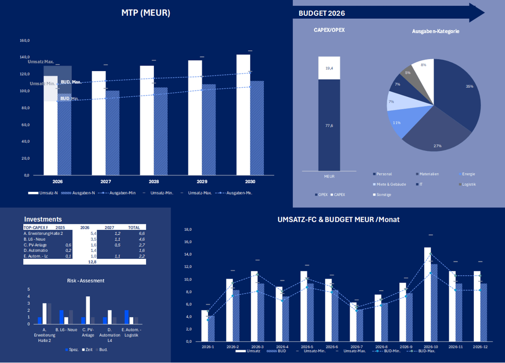 · Reality Check Budget: Plan–Ist–Forecast (inkl. CAPEX/OPEX) übereinanderlegen, Abweichungen und Hebel sichtbar machen.
