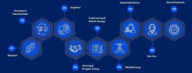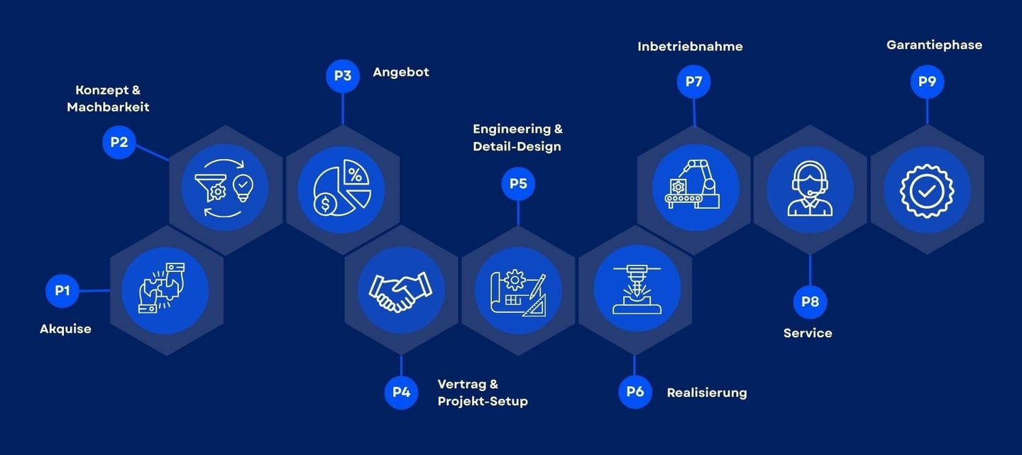 Der Projektabwicklungsprozess – von RFQ über Engineering, Aufbau, Inbetriebnahme bis in die Garantiephase – ist in der Kalkulation nicht abgebildet. Er existiert im Unternehmen zwar als gelebter Prozess, aber nicht als durchgängige Kalkulationslogik. Zudem wird der Projektleiter erst kurz nach der Beauftragung mit einbezogen.